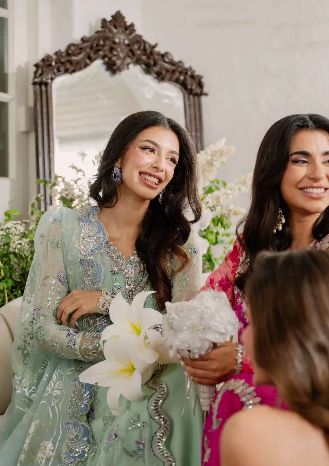 • Embroidered, sequinned front & back daman border (organza)